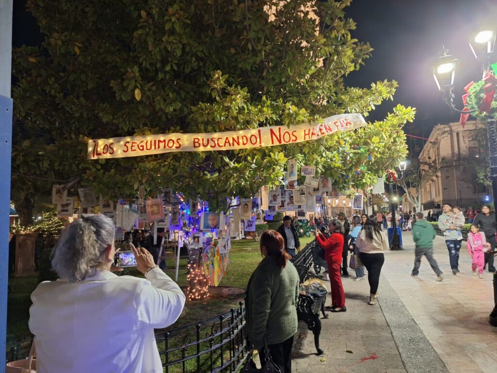 Familias enteras se acercaron al Árbol de la Esperanza para observar las fichas de búsqueda que, como lo comentó uno de los encargados de la iluminación de la mencionada plaza pública, no se adornaba “por respeto” a las personas desaparecidas. De hecho, el árbol destaca precisamente por no alcanzar la luz de la época navideña.