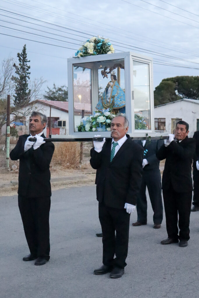La peregrinación seguía su curso. Los monaguillos, el grupo de coros con banderitas celestes, los jóvenes y una camioneta con una bocina que expulsaba: “DiostesalveMaríallenaeresdegracia … elseñorescontigo”. Ya oscurecía y el viento, los arcos, las sonajas, los tambores y las nahuillas adornaban las calles de un pueblo que la mayoría de las tardes lucía solitario.